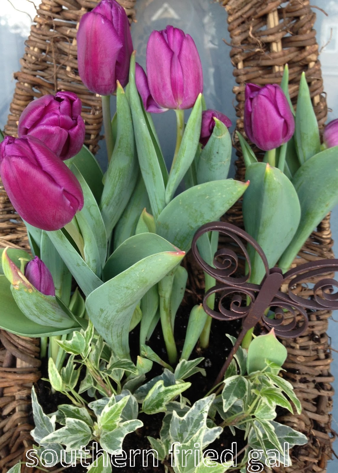Carefully remove the tulips from the pots, gently spread the roots around a bit and tuck into the basket. Fill in with potting soil being careful not to add soil above where they were in the pots. Repeat with the ivy.