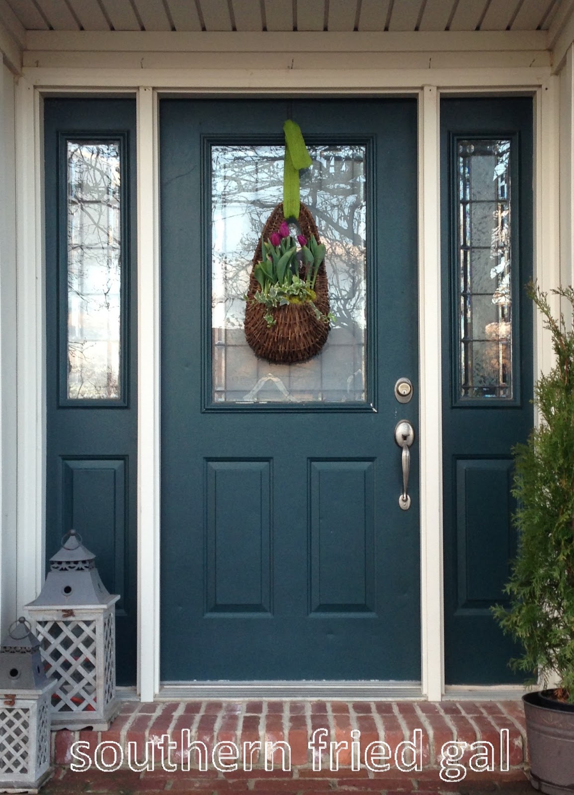 Then drop from your door with ribbon. I used bright green burlap ribbon (from A to Z in Alma, Arkansas for only $2.95 a roll) to add another spring touch. My basket full of posies came together for under $25 and about 30 minutes of fun.